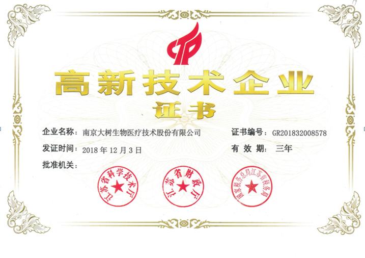 近日,我公司獲得由江蘇省科學(xué)技術(shù)廳、江蘇省財(cái)政廳、國(guó)家稅務(wù)總局江蘇省稅務(wù)局聯(lián)合頒發(fā)的“高新技術(shù)企業(yè)”證書,由此正式邁入國(guó)家高新技術(shù)企業(yè)行列。南京大樹生物醫(yī)療技術(shù)股份有限公司是一家集研發(fā)、生產(chǎn)、銷售為一體的專業(yè)體外診斷試劑醫(yī)療器械公司,公司秉承“質(zhì)量為先、信譽(yù)為重、以人為本、精益求精”的質(zhì)量方針,通過(guò)我們的專業(yè)技能和不懈努力竭力為廣大客戶提供創(chuàng)新優(yōu)質(zhì)的產(chǎn)品及完善的售后服務(wù)!